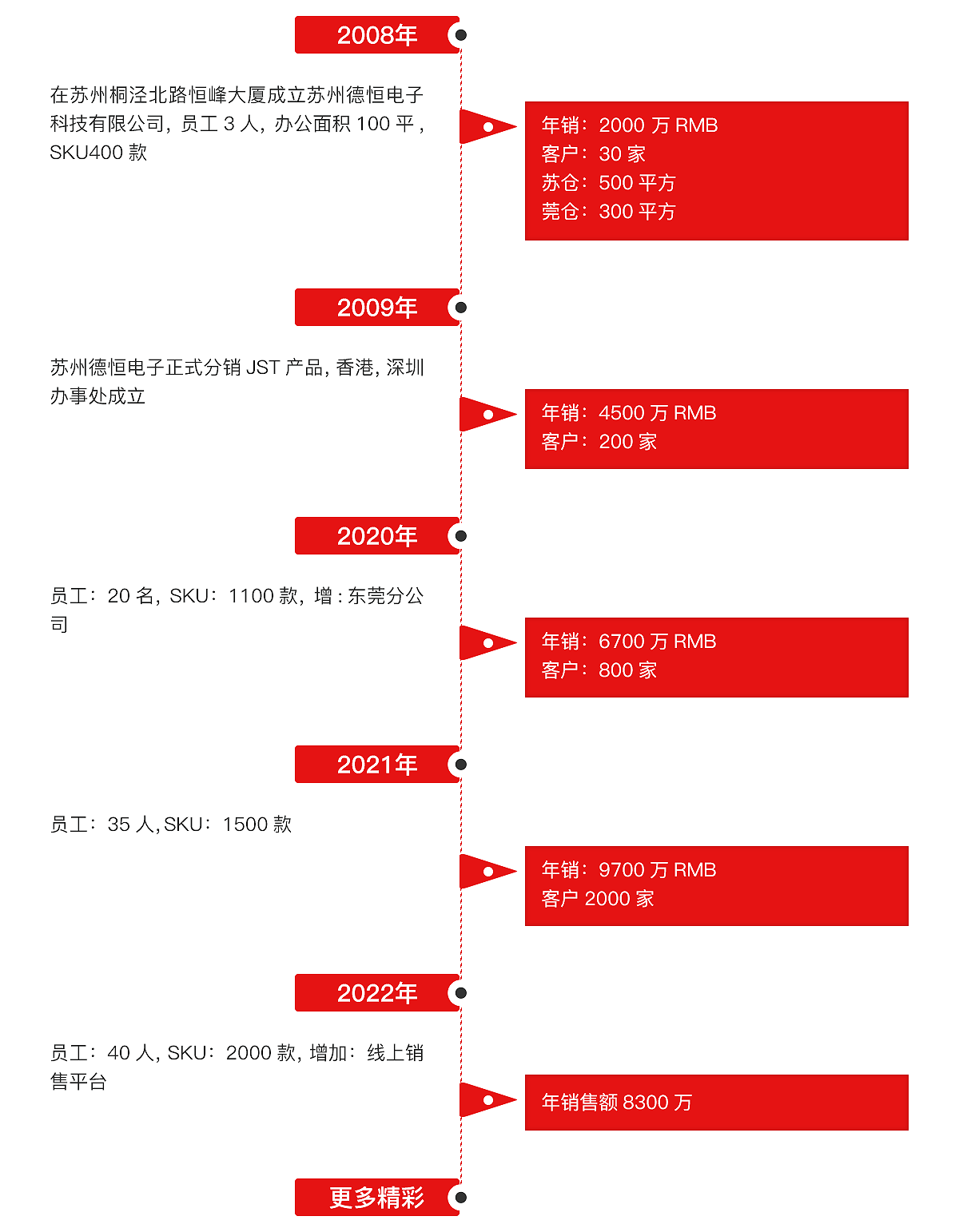 德恒电子深耕电子元件互连产品供应链分销代理服务,与全球优质供应商代理商贸易商有着长期紧密的合作。服务客户超2000+,提供SKU型号超过2000种,为客户提供安全准时的交付服务。